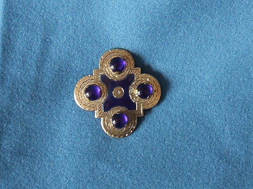 Eine Vierpassfibel mit Emaileinlage und Steinen.