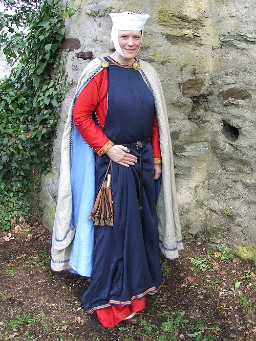 Die Kleidung einer Dame aus altem Adel: Cotte und Surcot bestehen aus Seide mit feinem, eigewebtem Muster und sind mit Borten verziert. Am metallbeschlagenen Gürtel ein aufwendig gefertigter Almosenbeutel aus Leder. Darüber trägt die Dame einen robusten Halbkreismantel aus Wolle, mit Leinen gefüttert, daran eine in Fingerschlaufen-Technik geflochtene Tasselschnur mit Tasselscheiben. Gebende und Haarnetz ergänzen die Kleidung.
