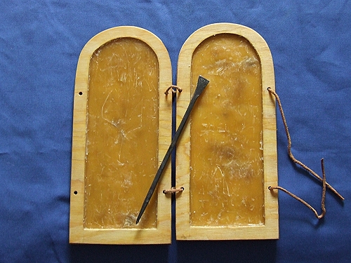 Ein Dyptichon aus Wachstafeln - ein mittelalterliches Notizbuch. Mit dem Griffel wird im Wachs geschrieben und wieder ausradiert.