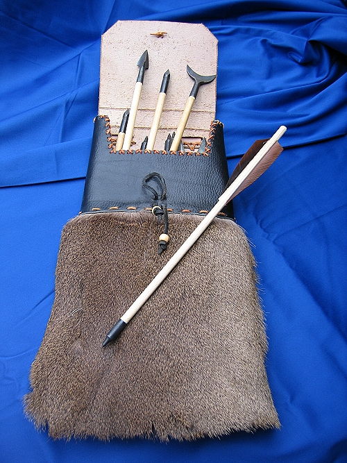 Armbrustbolzen werden im Köcher mit der Spitze nach oben aufbewahrt. Viele Bolzenköcher sind mit Fell bezogen.