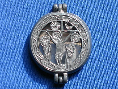 Ein kleiner gotischer Klappspiegel. Die Spiegelscheibe besteht aus poliertem Silber.